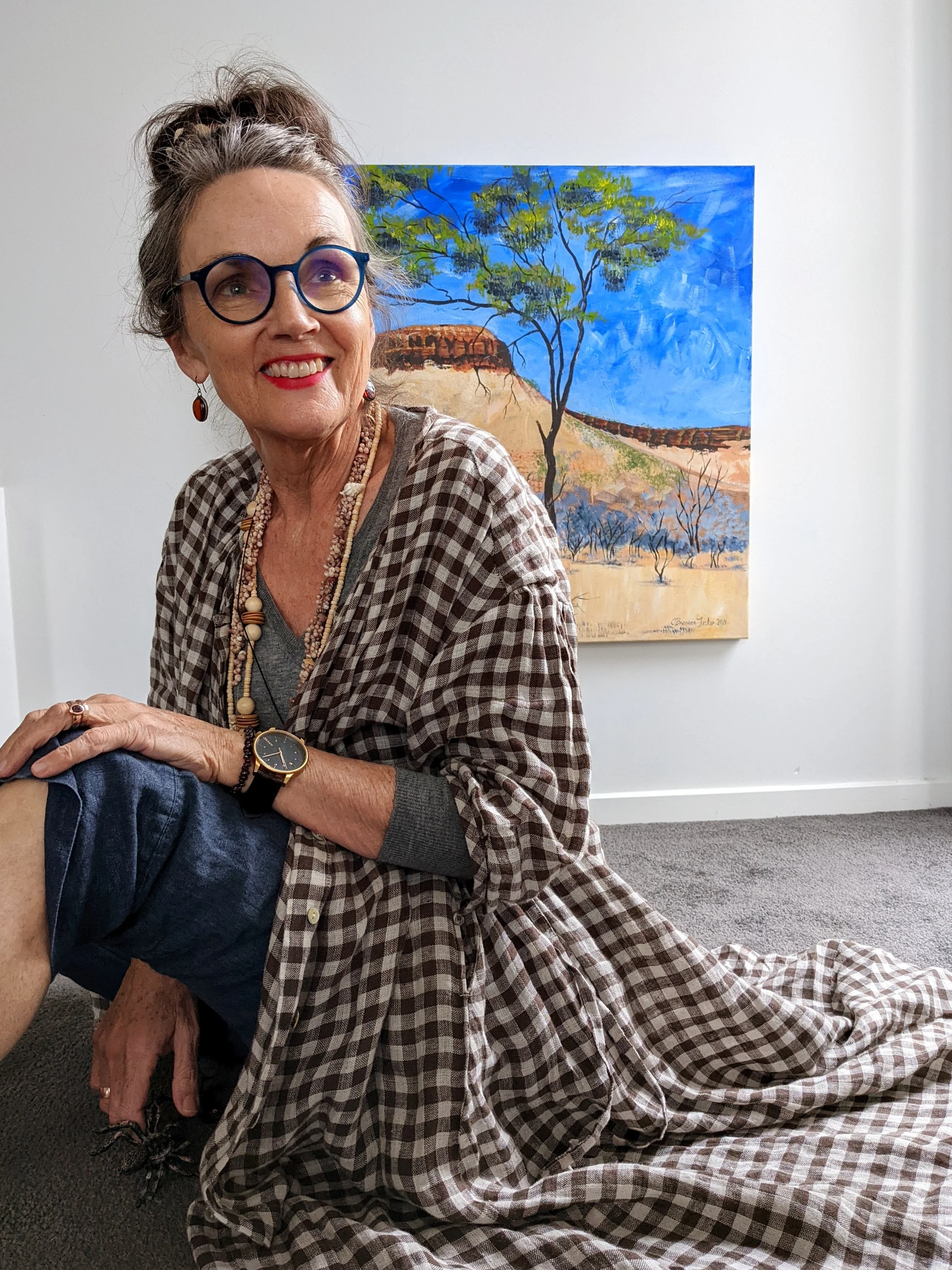 Carolyn Brennan-Tucker is a teacher and artist living in a remote community in the desert surrounded by the East MacDonnell Ranges in the Northern Territory. She paints the landscapes around her, often concentrating on the changing light over the desert landscape, its rocky hills, trees and beautiful cloud formations at dusk that she sees on her evening walks.